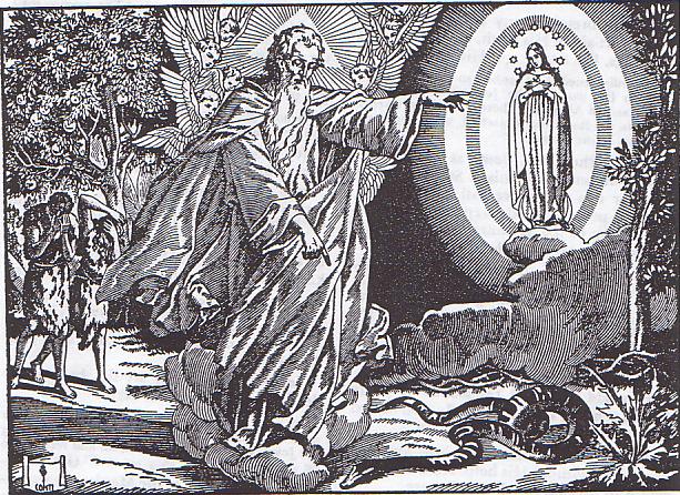 | Immediately after the Fall, God promised a Redeemer to Adam. He forgave man, although He had not forgiven the rebel angels. He was more merciful to man than to the angels. In making the promise, God spoke of the Blessed Virgin, who was to be the Saviour's Mother. |