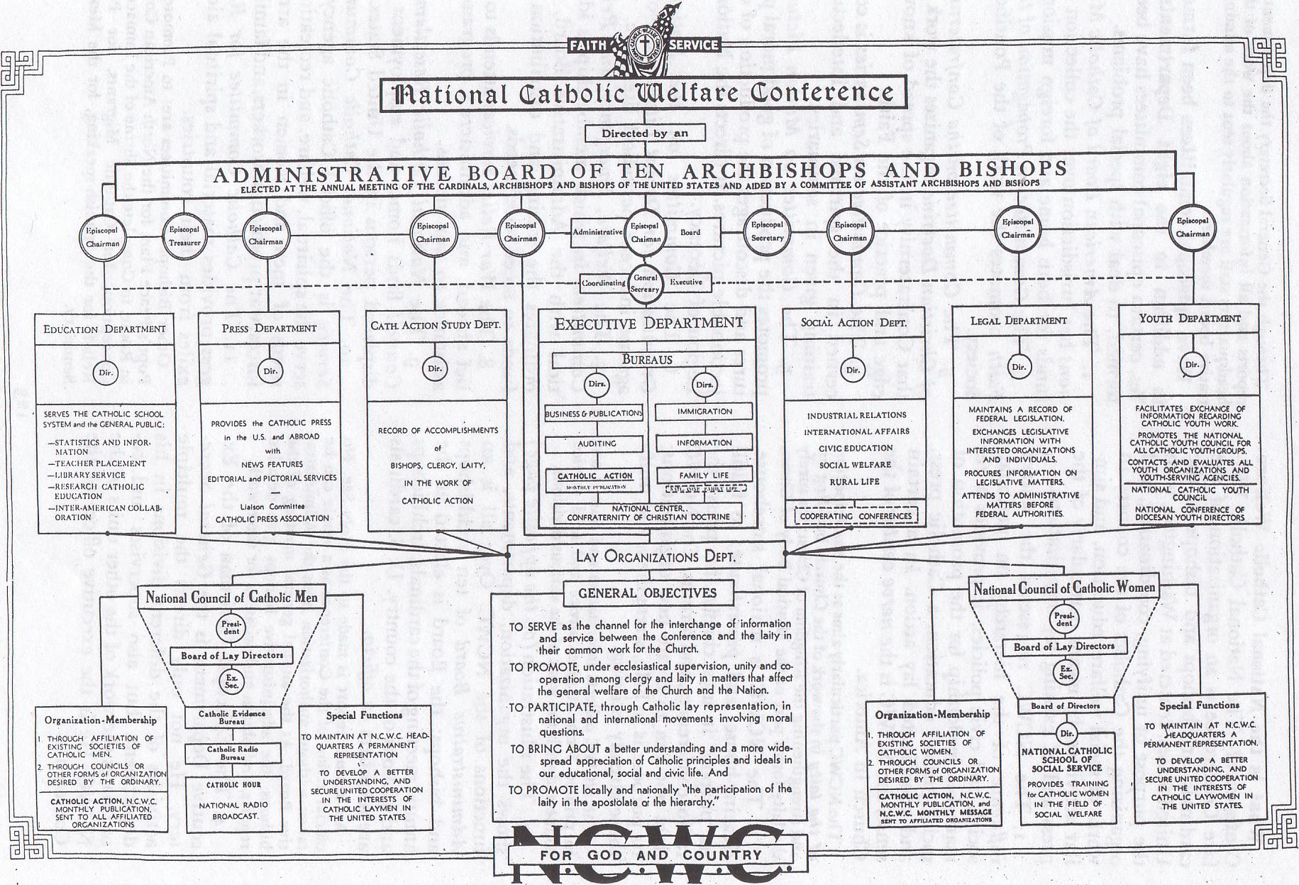 The illustration (above) shows the organization, departments, and functions of the NCWC. Over all is an Administrative Board of ten archbishops and bishops; the Board is elected at the annual meeting of the cardinals, archbishops and bishops of the country. U.S. cardinals are members ex officio.